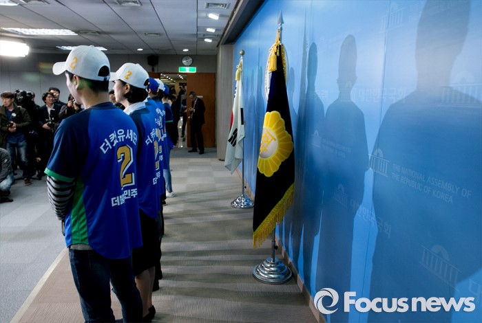 (서울=포커스뉴스) 더불어민주당에서 공천 탈락한 정청래, 김광진, 장하나 의원과 김빈 청년 비례대표 후보, 이동학 예비후보 등으로 구성된 '더컸유세단'이 28일 오전 서울 여의도 국회 정론관에서 출범 기자회견을 하고 있다.