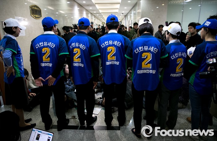 (서울=포커스뉴스) 더불어민주당에서 공천 탈락한 정청래, 김광진, 장하나 의원과 김빈 청년 비례대표 후보, 이동학 예비후보 등으로 구성된 '더컸유세단'이 28일 오전 서울 여의도 국회 정론관에서 출범 기자회견을 마친 뒤 취재진 질문에 답하고 있다.