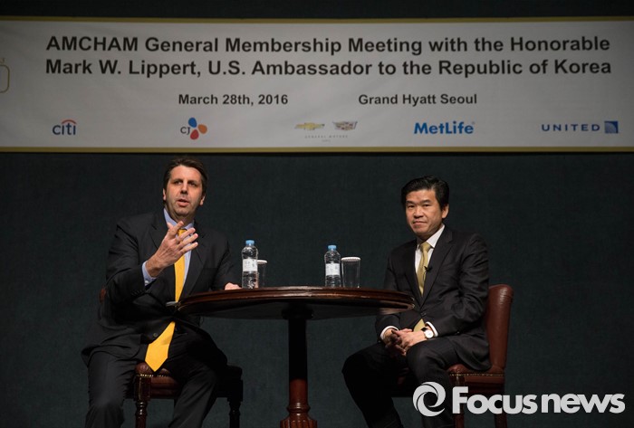 (서울=포커스뉴스) 마크 리퍼트 주한미국대사가 28일 오전 서울 용산구 그랜드하얏트 호텔에서 열린 '주한미국대사와의 오찬 간담회'에 참석, 사회자의 질문에 답변을 하고 있다.