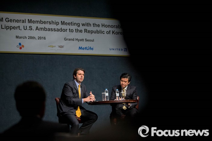 (서울=포커스뉴스) 마크 리퍼트 주한미국대사가 28일 오전 서울 용산구 그랜드하얏트 호텔에서 열린 '주한미국대사와의 오찬 간담회'에 참석, 사회자의 질문에 답변을 하고 있다.