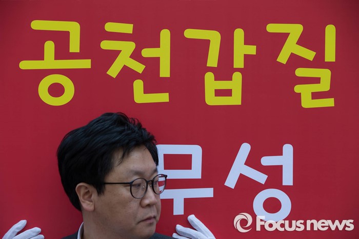(서울=포커스뉴스) 28일 오후 서울 영등포구 새누리당 당사 앞에서 대구 동구을 무공천 발표로 총선 출마가 좌절된 이재만 전 대구 동구청장의 지지자들이 김무성 새누리당 대표의 사퇴를 촉구하고 있다.