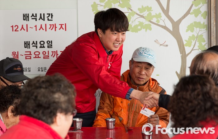 (서울=포커스뉴스) 이준석 새누리당 노원병 후보가 28일 오후 서울 노원구 당고개역 인근의 한 식당에서 선거 유세를 하고 있다.