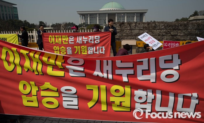 (서울=포커스뉴스) 28일 오후 서울 영등포구 국회 앞에서 대구 동구을 무공천 발표로 총선 출마가 좌절된 이재만 전 대구 동구청장의 지지자들이 김무성 새누리당 대표의 사퇴를 촉구하고 있다.