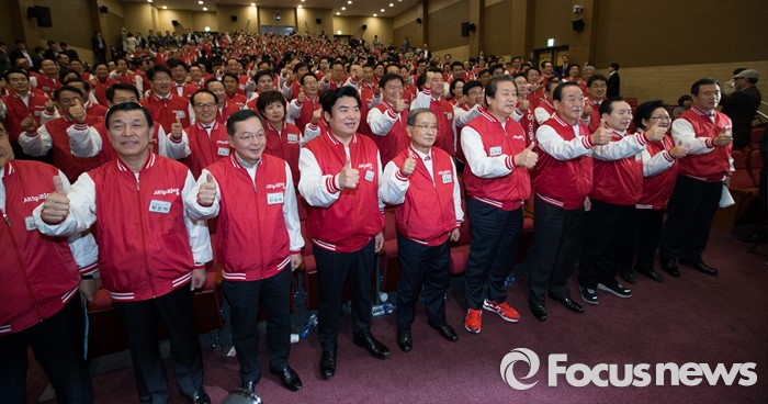 (서울=포커스뉴스) 28일 오후 서울 여의도 국회 의원회관 대회의실에서 열린 '제20대 총선 새누리당 공천자대회'에 참석한 김무성 새누리당 대표 등 당원들이 파이팅을 외치고 있다.