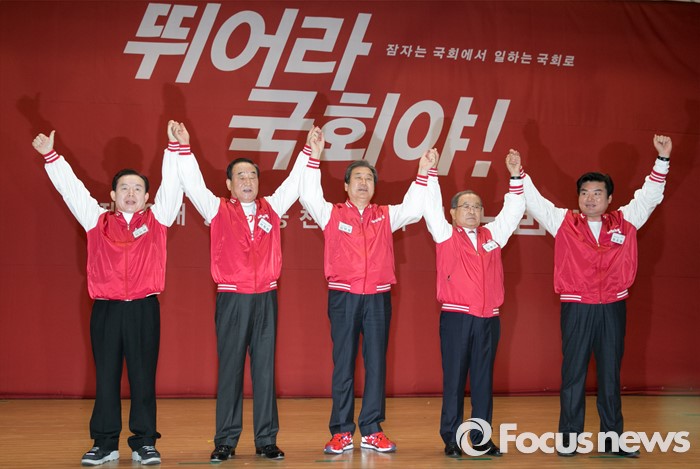 (서울=포커스뉴스) 28일 오후 서울 여의도 국회 의원회관에서 열린 새누리당 20대 총선 공천자대회에 참석한 공동선대위원장들이 손을 드어 포즈를 취하고 있다. 왼쪽부터 이인제, 서청원, 김무성, 강봉균, 원유철 위원장.