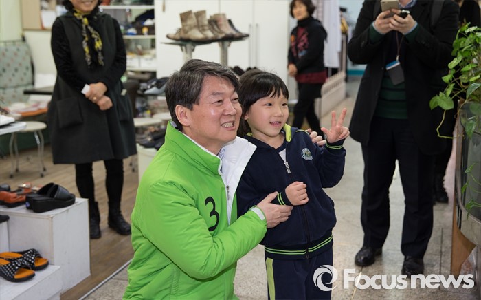 (서울=포커스뉴스) 20대 총선을 16일 앞둔 28일 오후 안철수 국민의당 서울 노원병 후보가 보람상가에서 한 어린이와 기념사진을 찍고 있다.