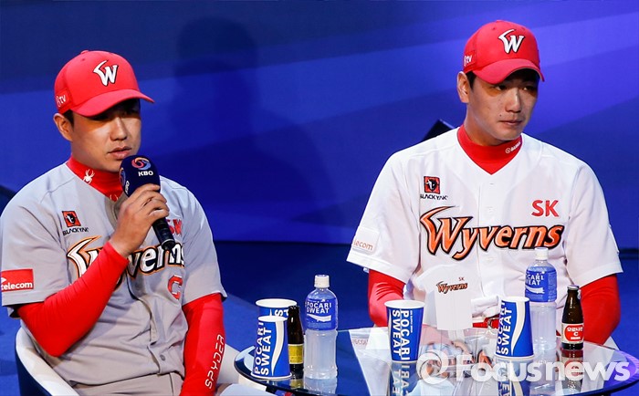 (서울=포커스뉴스) 28일 오후 서울 용산구 브루스퀘어 삼성카드홀에서 열린 '2016 타이어뱅크 프로야구 미디어데이 & 팬페스트' 행사에 참석한 SK 와이번스 김강민 선수가 새 시즌에 임하는 각오를 밝히고 있다.