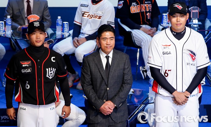 (서울=포커스뉴스) 28일 오후 서울 용산구 브루스퀘어 삼성카드홀에서 열린 '2016 타이어뱅크 프로야구 미디어데이 & 팬페스트' 행사에 참석한 kt 위즈 조범현 감독(가운데)과 박경수, 조무근이 포즈를 취하고 있다.