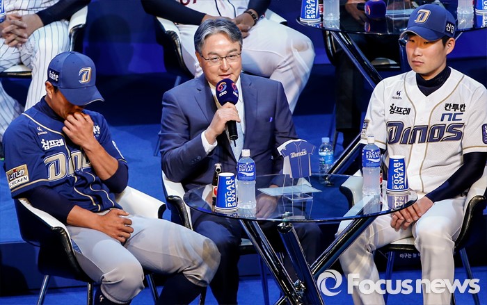 (서울=포커스뉴스) 28일 오후 서울 용산구 브루스퀘어 삼성카드홀에서 열린 '2016 타이어뱅크 프로야구 미디어데이 & 팬페스트' 행사에 참석한 NC 다이노스 김경문 감독이새 시즌 출사표를 밝히고 있다.