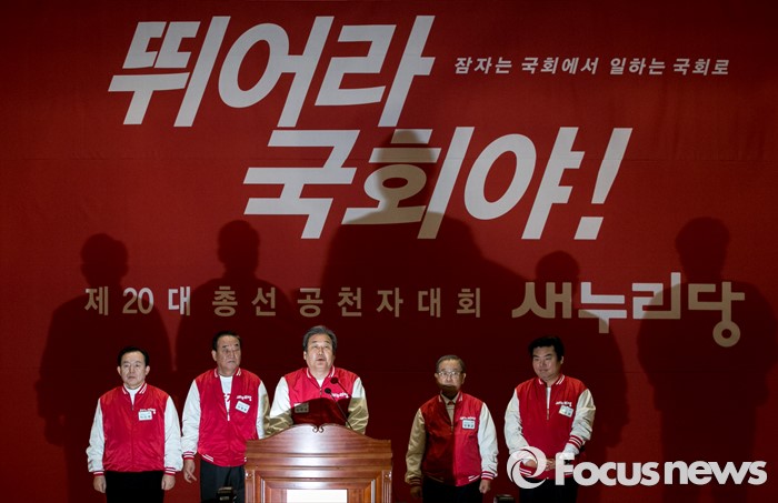 (서울=포커스뉴스) 28일 오후 서울 여의도 국회 의원회관에서 열린 새누리당 20대 총선 공천자대회에 참석한 공동선대위원장들이 인사하고 있다. 왼쪽부터 이인제, 서청원, 김무성, 강봉균, 원유철 위원장.