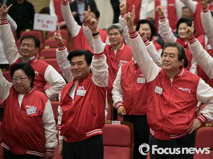 (서울=포커스뉴스) 28일 오후 서울 여의도 국회 의원회관에서 열린 새누리당 20대 총선 공천자대회에 참석한 김무성, 원유철 공동선대위원장 등 지도부와 후보들이 선거유세 율동을 배우고 있다.