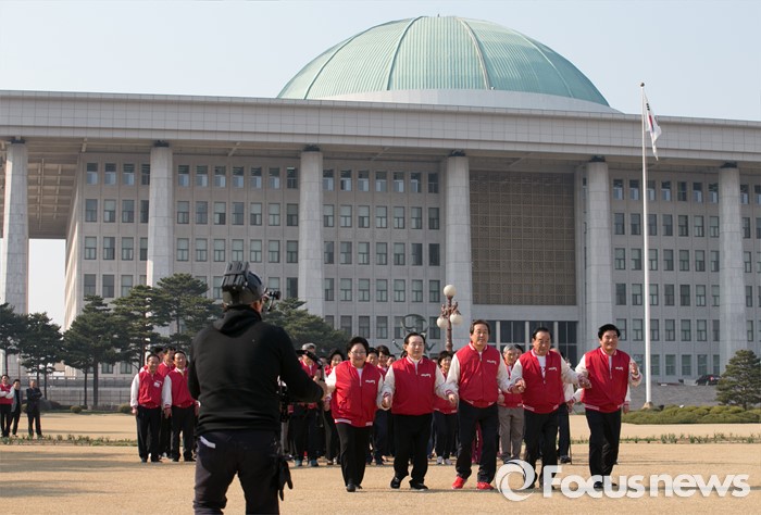 (서울=포커스뉴스) 28일 오후 서울 여의도 국회 의원회관에서 열린 새누리당 20대 총선 공천자대회를 마친 뒤 김무성, 원유철, 서청원 공동선대위원장 등 지도부와 후보들이 선거홍보용 영상을 촬영하고 있다.