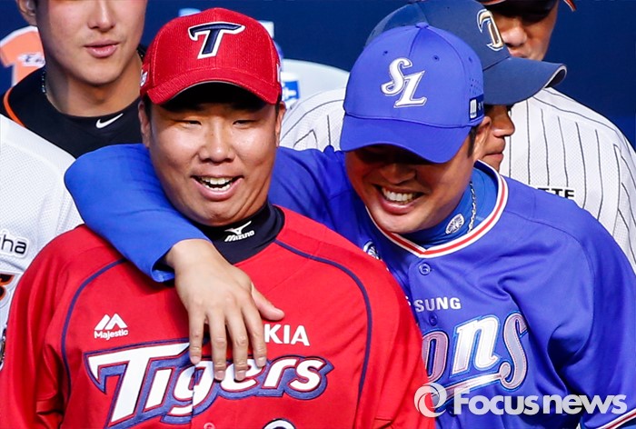 (서울=포커스뉴스) 28일 오후 서울 용산구 브루스퀘어 삼성카드홀에서 열린 '2016 타이어뱅크 프로야구 미디어데이 & 팬페스트' 행사에 참석한 이범호, 박한이 선수가 어깨동무를 하고 있다.