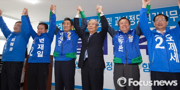 (괴산=포커스뉴스) 김종인 더불어민주당 비상대책위 대표가 28일 오후 충북 괴산군 정당선거사무소에서 열린 20대 총선 충북 후보 연석회의에서 충북지역 후보자들과 필승을 다짐하고 있다.