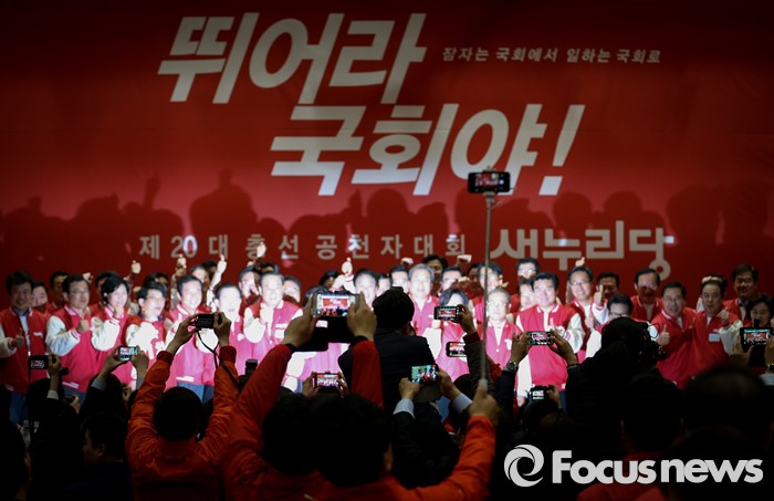 (서울=포커스뉴스) 28일 오후 서울 여의도 국회 의원회관에서 열린 새누리당 20대 총선 공천자대회에 참석자들이 경기도 지역 후보들과 지도부의 포즈 취한 모습을 촬영하고 있다.