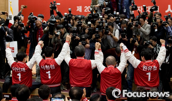 (서울=포커스뉴스) 28일 오후 서울 여의도 국회 의원회관에서 열린 새누리당 20대 총선 공천자대회에 참석한 이인제(왼쪽부터), 서청원, 김무성, 강봉균, 원유철 공동선대위원이 손을 들어 취재진을 향해 포즈를 취하고 있다.