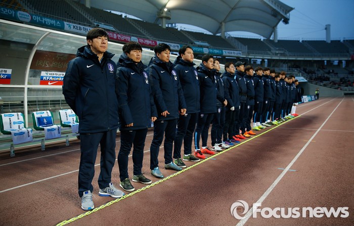 (고양=포커스뉴스) 28일 오후 경기 고양종합운동장에서 열린 올림픽축구대표팀 2차 평가전 대한민국과 알제리의 경기에서 신태용 감독과 코치진이 경기시작을 기다리고 있다.