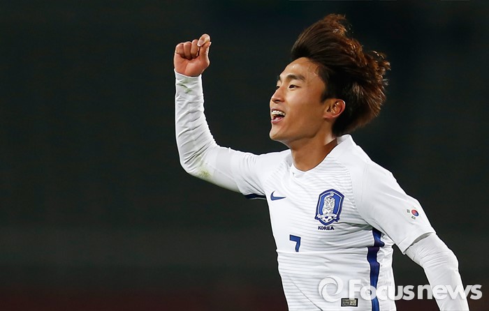 (고양=포커스뉴스) 28일 오후 경기 고양종합운동장에서 열린 올림픽축구대표팀 2차 평가전 대한민국과 알제리의 경기에서 한국 문창진이 후반전 추가골을 넣고 세리머니를 하고 있다.