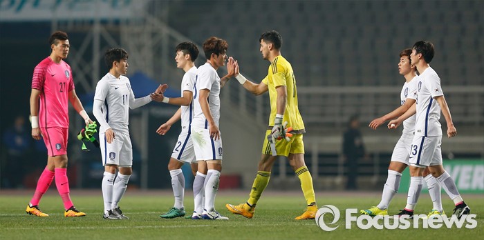 (고양=포커스뉴스) 28일 오후 경기 고양종합운동장에서 열린 올림픽축구대표팀 2차 평가전 대한민국과 알제리의 경기에서 3-0으로 승리한 한국 선수들이 경기종료 후 하이파이브를 하고 있다.