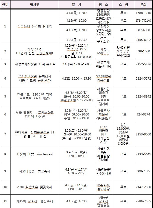 다음달 문화행사 문의는 서울문화포털(http://culture.seoul.go.kr)과 120 다산콜센터에서 하면 된다.4월 서울시 행사 개요, <표제공=서울시청>