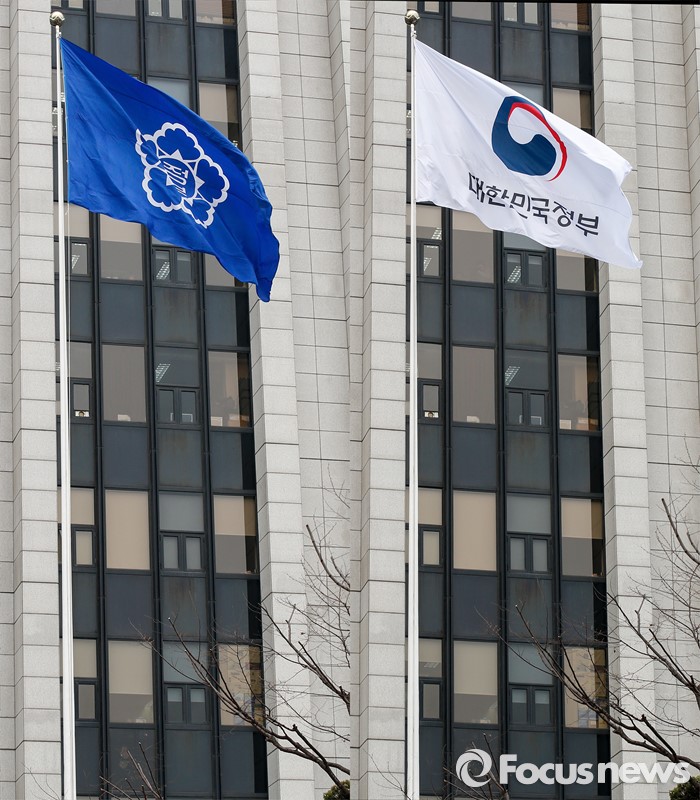 (서울=포커스뉴스) 29일 오전 서울 종로구 정부서울청사에서 대한민국 정부기 게양식이 열렸다. 과거 무궁화문양 정부기(좌측)와 새롭게 사용된 태극문양 정부기. 정부는 67년간 사용해온 '무궁화'에서 '태극' 도안으로 바뀐 새 정부기를 정부세종청사와 서울청사 등 10개 청사에 게양했다.