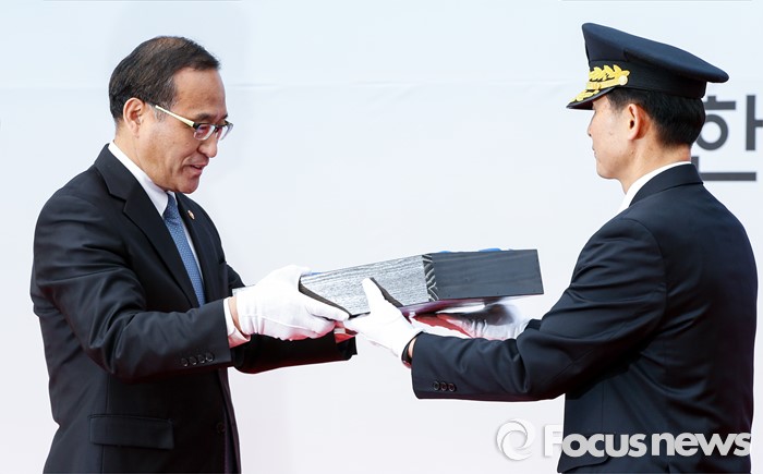 (서울=포커스뉴스) 29일 오전 서울 종로구 정부서울청사에서 대한민국 정부기 게양식이 열렸다. 이날 행사에 참석한 홍윤식 행정자치부 장관이 옛 정부기를 전달받고 있다. 정부는 67년간 사용해온 '무궁화'에서 '태극' 도안으로 바뀐 새 정부기를 정부세종청사와 서울청사 등 10개 청사에 게양했다.