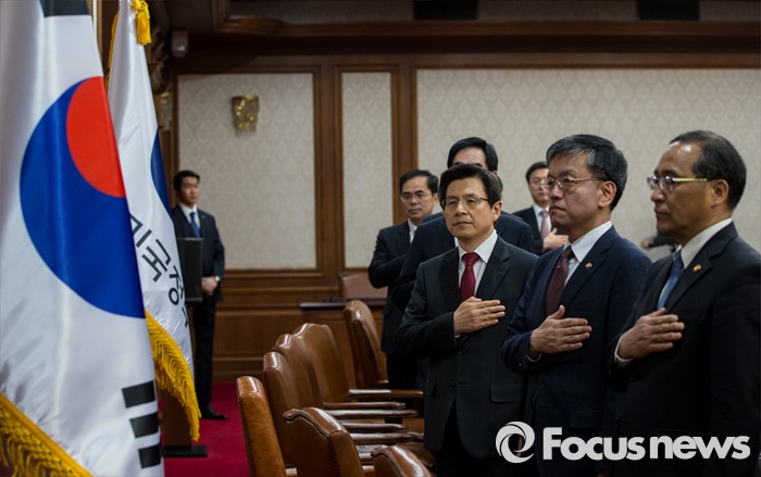 (서울=포커스뉴스) 29일 오전 서울 종로구 정부서울청사에서 열린 국무회의에 참석한황교안 국무총리와 국무위원들이 국민의례를 하고 있다.