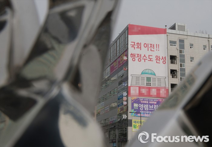 (세종=포커스뉴스) 29일 오전 세종시 국회의원 후보 선거사무소 외벽에 '국회이전, 행정수도 완성'이라는 공약이 적힌 현수막이 걸려있다.