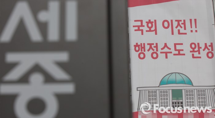 (세종=포커스뉴스) 29일 오전 세종시 국회의원 후보 선거사무소 외벽에 '국회이전, 행정수도 완성'이라는 공약이 적힌 현수막이 걸려있다.