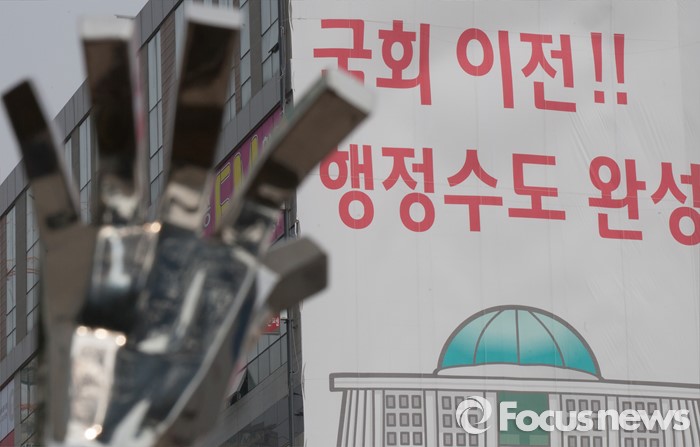 (세종=포커스뉴스) 29일 오전 세종시 국회의원 후보 선거사무소 외벽에 '국회이전, 행정수도 완성'이라는 공약이 적힌 현수막이 걸려있다.