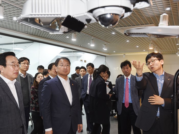 (부산=포커스뉴스) 유일호 부총리 겸 기획재정부 장관이 29일 규제프리존을 통한 지역전략산업육성을 위한 현장으로 부산 소재 IoT 글로벌 스마트시티 실증지원센터를 방문, 스마트가로등, 안심태그 등 실증서비스에 관한 설명을 듣고 있다. <사진제공=기획재정부>