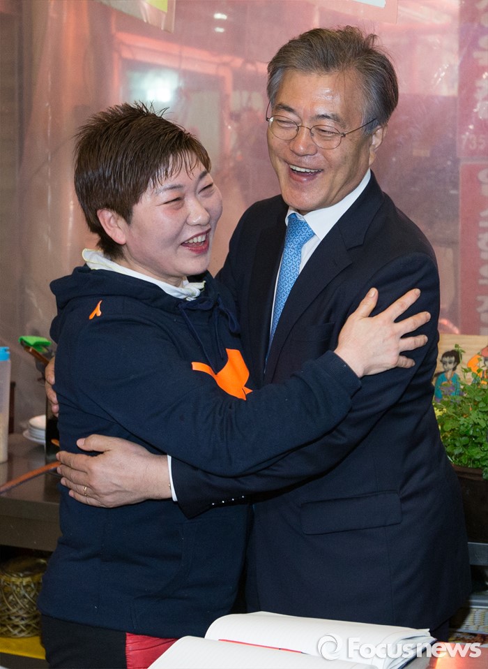 (논산=포커스뉴스) 문재인 더불어민주당 전 대표가 29일 오후 충남 논산시 중앙시장을 방문해 시민과 포옹을 하고 있다.