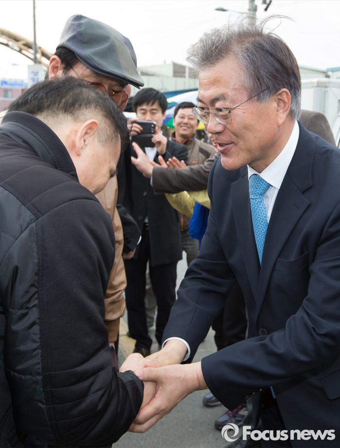 (논산=포커스뉴스) 문재인 더불어민주당 전 대표가 29일 오후 충남 논산시 중앙시장을 방문해 시민들과 악수하며 김종민 후보의 지지를 호소하고 있다.