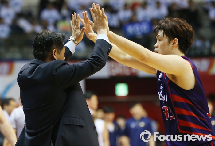 (고양=포커스뉴스) 29일 고양체육관에서 열린 2015-2016 프로농구 챔피언결정전 6차전 오리온-KCC 경기에서 오리온 추일승 감독이 작전타임에 들어오는 이승현과 하이파이브를 하고 있다.