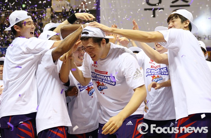(고양=포커스뉴스) 29일 고양체육관에서 열린 2015-2016 프로농구 챔피언결정전 6차전에서 승리하며 4승 2패로 우승한 오리온 선수들이 MVP에 선정된 이승현을 축하하고 있다.