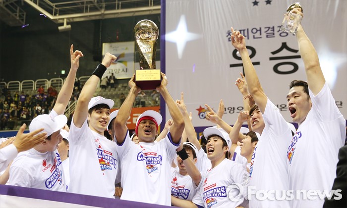 (고양=포커스뉴스) 29일 고양체육관에서 열린 2015-2016 프로농구 챔피언결정전 6차전에서 승리하며 4승 2패로 우승한 오리온 선수들이 트로피를 들어 올리며 환호하고 있다.