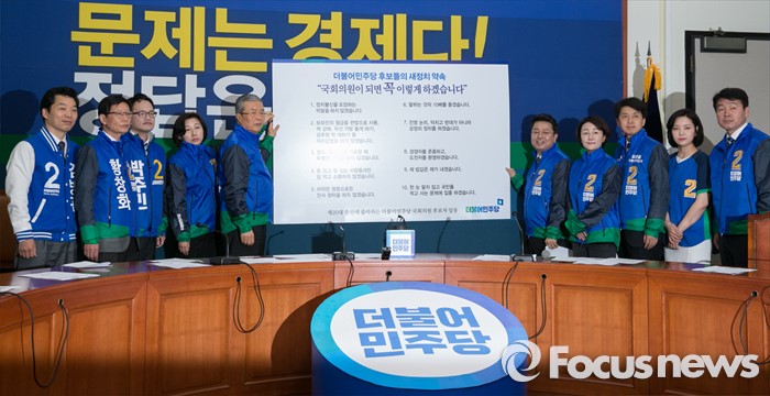 (서울=포커스뉴스) 김종인(왼쪽 다섯번째) 더불어민주당 비대위 대표와 김병관 경기 성남분당갑, 황창화 서울 노원병 후보 등 20대 총선 후보들이 30일 오전 서울 여의도 국회에서 더민주 후보들의 새정치 약속 발표를 하고 있다.