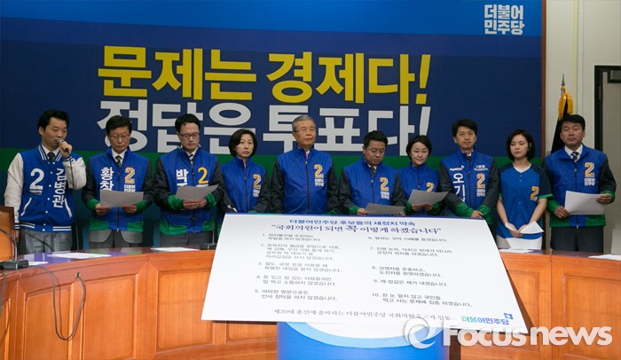 (서울=포커스뉴스) 김종인(왼쪽 다섯번째) 더불어민주당 비대위 대표와 김병관 경기 성남분당갑, 황창화 서울 노원병 후보 등 20대 총선 후보들이 30일 오전 서울 여의도 국회에서 더민주 후보들의 새정치 약속 발표를 하고 있다.