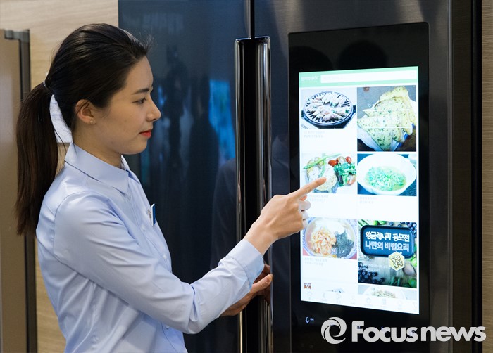 (서울=포커스뉴스) 30일 오전 서울 강남구 삼성전자 서초사옥에서 관계자가 '2016 삼성전자 패밀리 허브' 냉장고를 선보이고 있다.