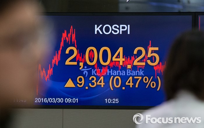 (서울=포커스뉴스) 30일 서울 중구 KEB외환은행 본점 딜링룸 전광판에 코스피 지수가 전일보다 9.34p (0.47%) 상승한 2004.25를 나타내고 있다. 이날 코스피지수는 재닛 옐런 미국 중앙은행(Fed) 의장의 비둘기파 발언에 힘입어 시가 기준 2000선을 돌파했다. 코스피가 시가 기준으로 2000선을 돌파한 것은 지난해 12월24일(2009.34) 이후 처음이다.