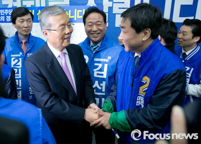 (수원=포커스뉴스) 30일 오전 수원 팔달구 경기도의회에서 더불어민주당 경제살리기 경기 국회의원 후보자 연석회의를 마친 뒤 김종인(왼쪽) 비대위 대표와 이종걸 원내대표가 악수하고 있다.