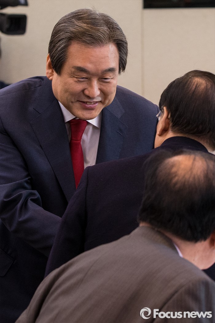 서울=포커스뉴스) 30일 오후 서울 중구 프레스센터에서 열린 관훈클럽 초청 관훈토론회에 참석한 김무성 새누리당 대표가 참석자들과 악수하고 있다.