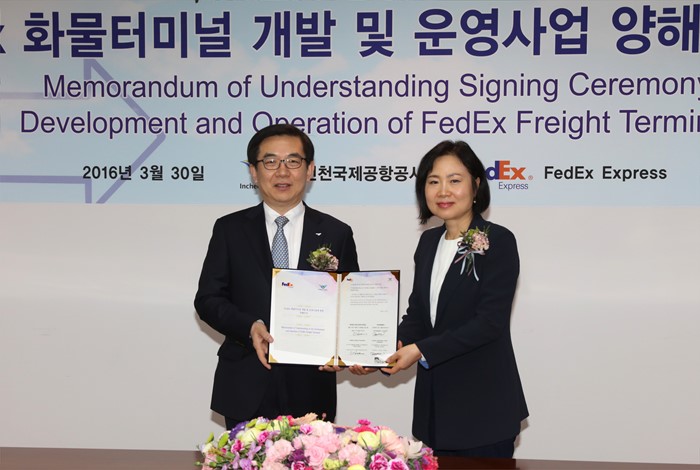 (인천공항=포커스뉴스) 정일영 인천국제공항공사장과채은미 Federal Express 대표이사가 30일 인천공항 FedEx 화물터미널 개발 및 운영사업 추진을 위한 양해각서를 체결하고 기념촬영 하고 있다.