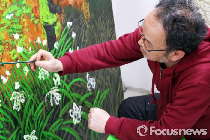 "본격적으로 그림을 그린 건 2002년인가. 우 사장이 어느 날 저에게 '나 같으면 그림 그리겠다'라고 말했습니다. 그래서 평소에 그리면 좋겠다고 생각했던 장소를 딱 찍으라고 했습니다. 그럼 그걸 그리겠다고 말이죠. 그래서 작품 제목이 '친구가 권유한 풍경'이 됐습니다. 우 사장이 산과 들에 채집하러 갈 때 같이 가면 저에게 그릴 곳을 정해주고 자기 볼일 보러 갔습니다. 그렇게 계속 같이 다니다보니 상당히 많은 그림을 그리게 됐습니다."