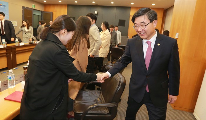 (서울=포커스뉴스) 이기권 고용노동부 장관이 30일 오전 서울 강남구 한국무역협회(51층 소회의실)에서 열린 해외진출을 도전하는 청년들과의 대화에 참석해 참석자와 악수를 하고 있다. <사진제공=고용노동부>
