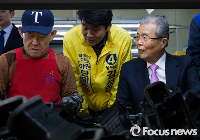 (인천=포커스뉴스) 김종인(오른쪽) 더불어민주당 비대위 대표와 김성진(가운데) 정의당 인천 남구을 야권 단일후보가 30일 오후 인천 남구 노인인력센터를 방문, 자동차 부품을 만드는 어르신과 대화하고 있다.