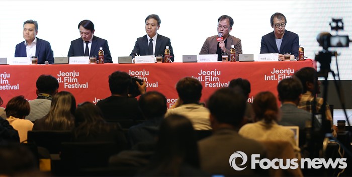 (서울=포커스뉴스) 30일 오후 서울 영등포구 글래드호텔에서 열린 '제17회 전주국제영화제 상영작 발표 기자회견' 에 참석한 김영진(왼쪽 네번재) 수석프로그래머가 상영작에 대한 설명을 하고 있다. 왼쪽부터 장병원 프로그래머, 이충직 집행위원장, 김승수 조직위원장, 김영진 수석프로그래머, 이상용 프로그래머.