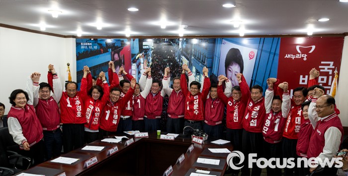 (대구=포커스뉴스) 김무성 새누리당 대표를 비롯한 대구 경북지역 총선 출마 후보들이 30일 오후 대구 수성구 새누리당 대구시당에서 열린 '선거대책위원회의'에 참석해 손을 맞잡고 사진촬영을 하고 있다.