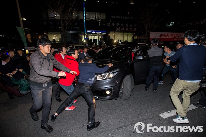 (대구=포커스뉴스) 김무성 새누리당 대표가 30일 오후 대구 수성구 새누리당 대구시당에서 열린 '선거대책위원회의'에 참석해 회의를 마친 뒤 차량에 탑승해 이동하자 이재만 새누리당 대구 동구을 예비후보 지지자들이 김 대표의 사퇴를 요구하며 저지하고 있다.