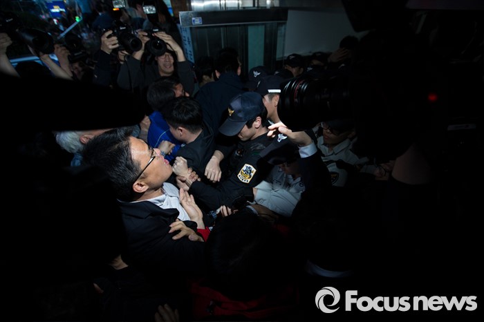 (대구=포커스뉴스) 30일 오후 대구 수성구 새누리당 대구시당 앞에서 이재만 새누리당 대구 동구을 예비후보 지지자들이 '선거대책위원회의'에 참석하기 위해 대구를 방문한 김무성 새누리당 대표에게 항의하려하자 경찰병력이 제지 하고 있다.